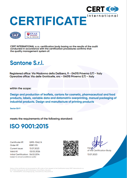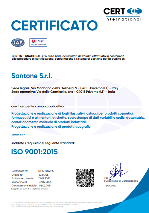 Crediamo nell’importanza di consolidare e mantenere i requisiti di qualità per i nostri servizi e per la nostra identità aziendale con l’obiettivo di assicurare alla nostra clientela alte prestazioni in un’ottica di miglioramento continuo. La Santone s.r.l è in possesso di un Sistema di Gestione della Qualità certificato secondo la norma UNI EN ISO 9001:2015